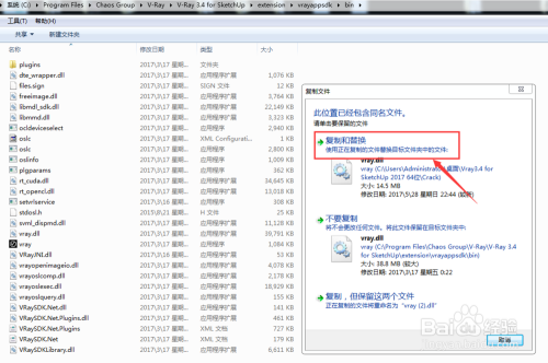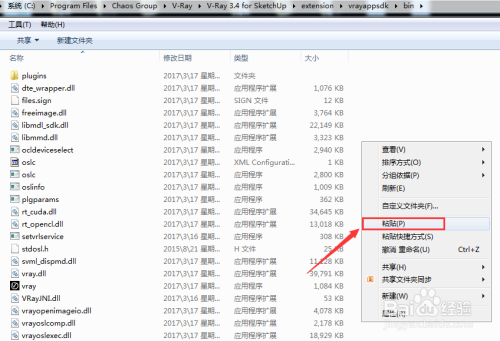 打开“C:\ProgramFiles\Chao Group\V-Ray 3.4 for SketchUp\extension\vrayappsdk\bin”,在空白处鼠标右击,选择“粘贴”,再选择“复制和替代”。