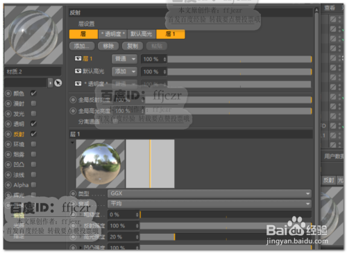建立一个玻璃材质,打消颜色通道,在透明通道中界说折射率为1.5,其它默认不变;在反射通道添加一个GGX层,即可。