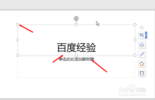 然后按住鼠标左键在PPT画布上直接拖动即可形当作一个文本框,然后就可以直接在文本框中打字,还可以点击文本框边缘的八个圆圈来调整文本框的大小