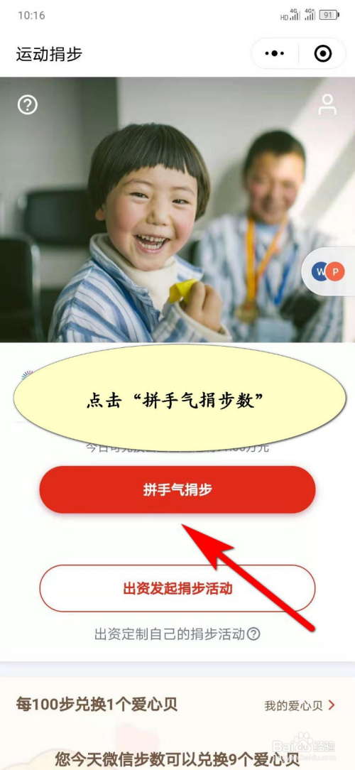 在活动捐步界面,点击“拼手气捐步”即可给公益项目捐赠步数。