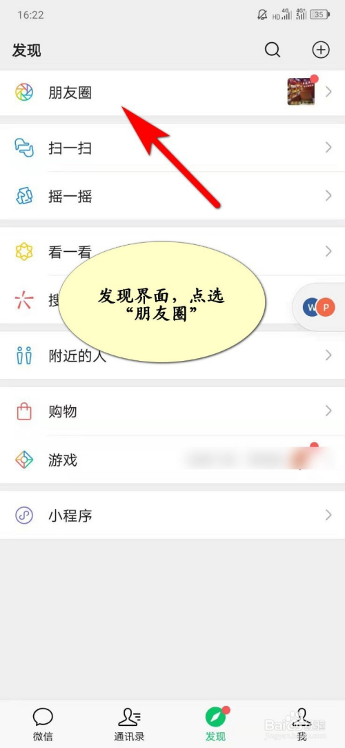 发现界面,点击“朋友圈”;