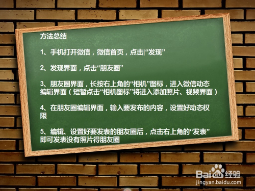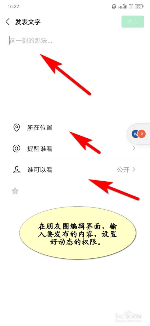 在朋友圈编纂界面,输入要发布的内容,设置好动态权限;