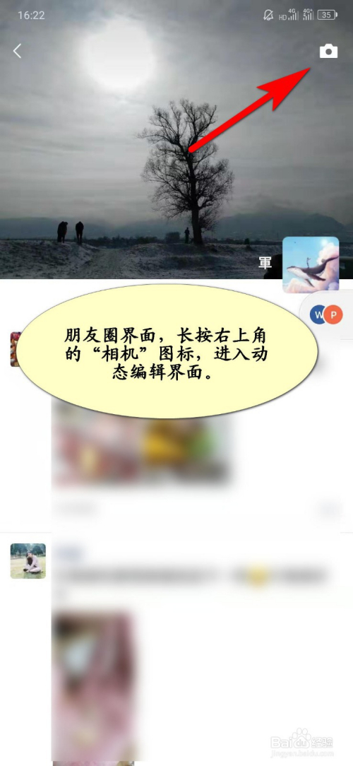 3、朋友圈界面,长按右上角的“相机”图标,进入微信动态编纂界面(短暂点击“相机图标”将进入添加照片、视频界面)