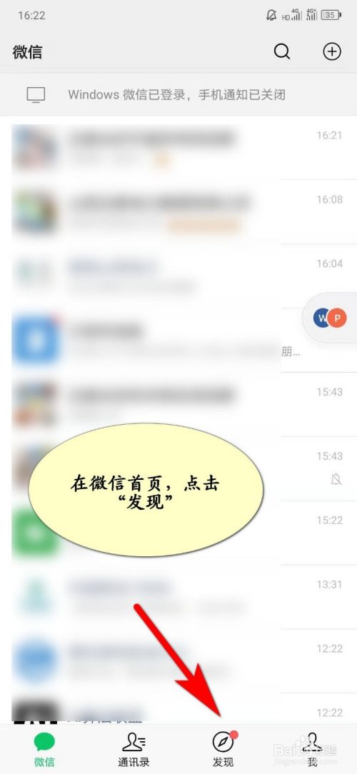 手机打开微信,微信首页,点击“发现”;