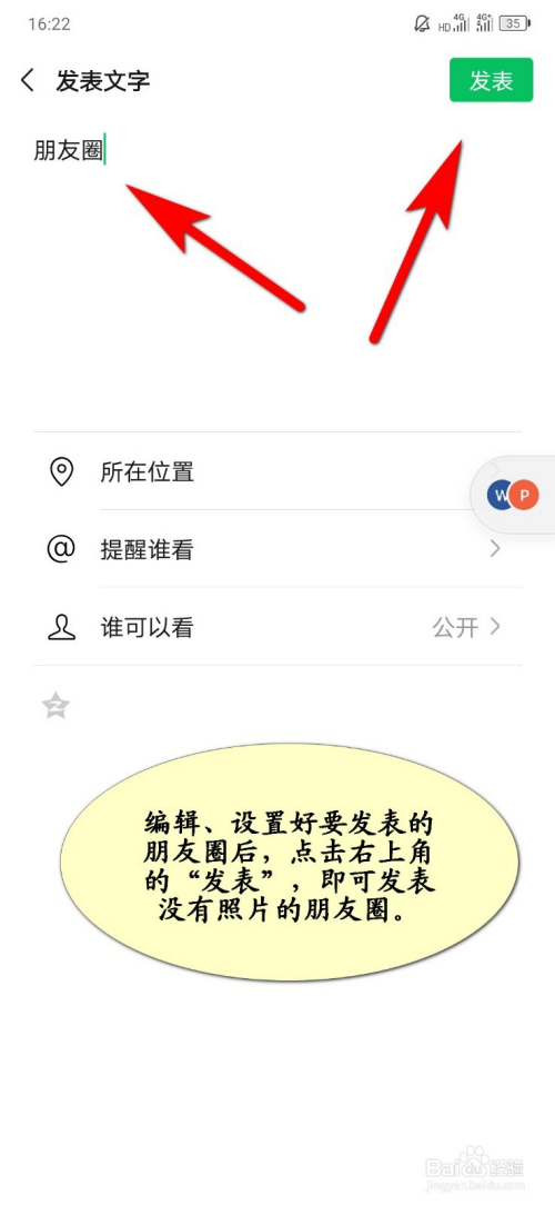 编纂、设置好要颁发的朋友圈后,点击右上角的“颁发”即可颁发没有照片得朋友圈;