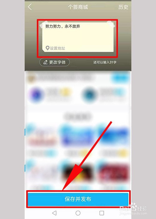 进入后,删除本来的个性签名内容,填入新的个性签名内容,点击下方箭头处【保留并发布】,即可当作功颁发个性签名。