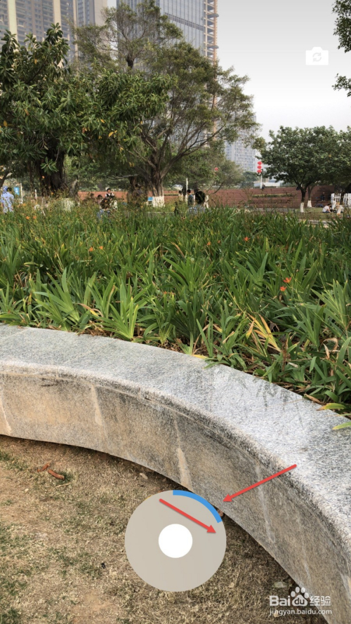 之后,我们点击圆形的拍摄按钮,如下图箭头所指的位置,即可起头拍摄小视频。拍摄的时辰,手指要按着不动,拍完之后再松开。