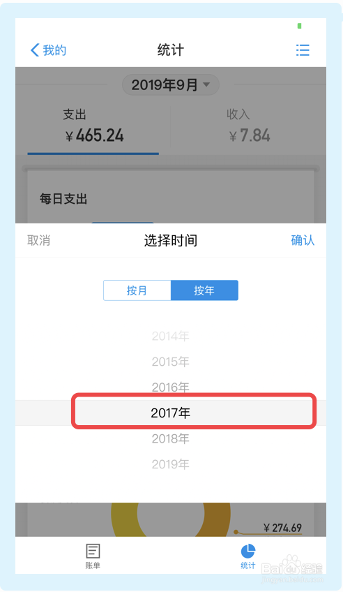 4.在【统计】界面,点击日期按钮,接下来在弹出框中选择并点击【按年】按钮,其次选摘要查看哪年的额账单,如200年,则选择2007年,最后点击【确认】按钮,即可查看支付宝2007年的账单(即支付宝年度账单)。