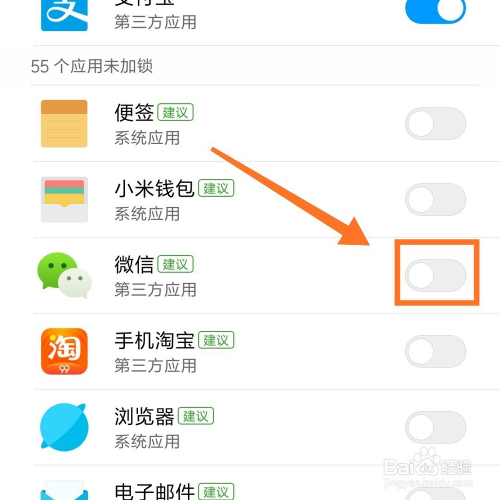 我们下拉找到微信,将右边的图标滑标的目的右边打开。