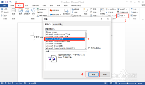 在弹出来的【对象】选择界面,选中【Microsoft Excel 工作表】,点击【确定】按钮
