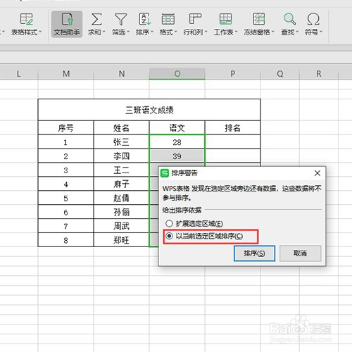 在弹出的页面中选择以当前选定区域排序,如图所示。