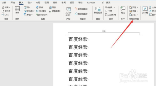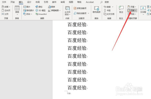 其次,找到菜单栏“插入”功能区的”页眉页脚“