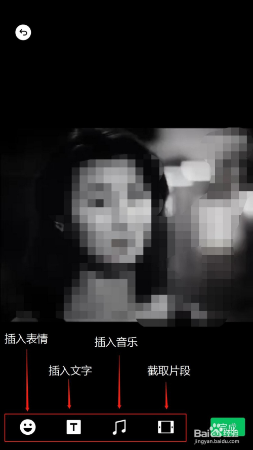 截取完当作后,点击完当作,会发此刻下方还有“插入脸色”、“插入文字”、“插入音乐”和“截取片段”图标,我们可以按照本身的需要,别离进行编纂,如图所示: