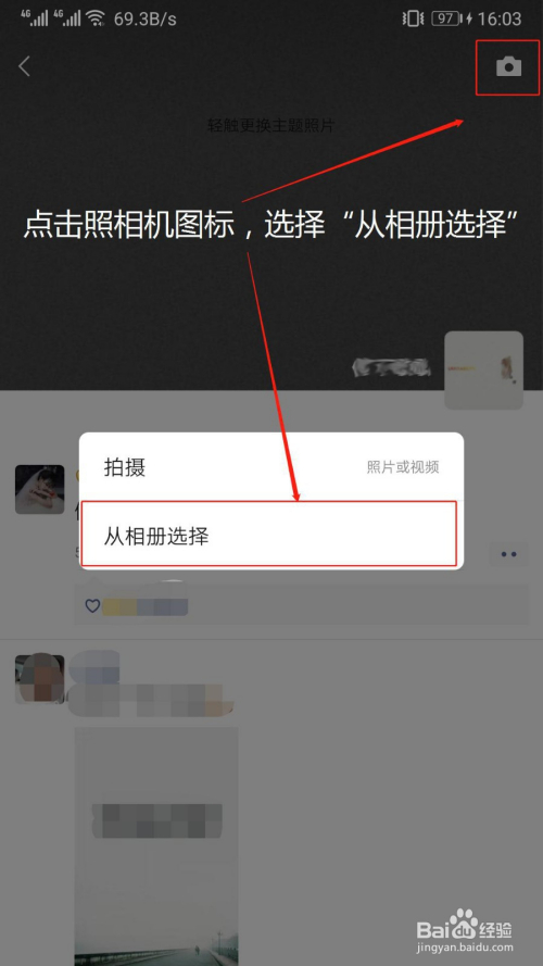 这时会进入“朋友圈”的展示界面,在朋友圈界面的右上方,我们可以看到有一个拍照机样式的图标,点击该图标,会弹出一个对话框,里面有“拍摄”和“从相册选择”两个选项,因为我们是要上传视频,故选择“从相册选择选项”,如图所示: