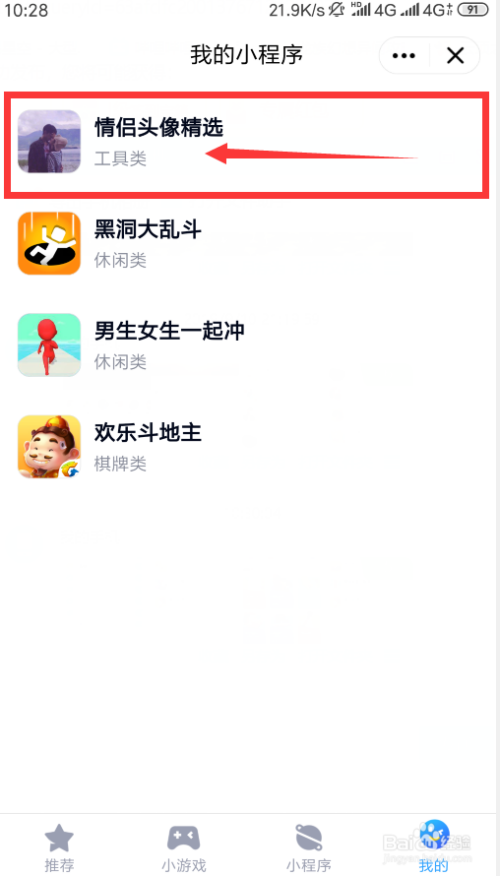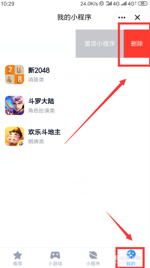 第五步。大师可以用手指在我们想删除的小程序的右边往左边齐截下。如下图所示。