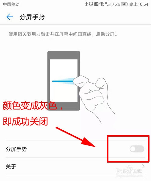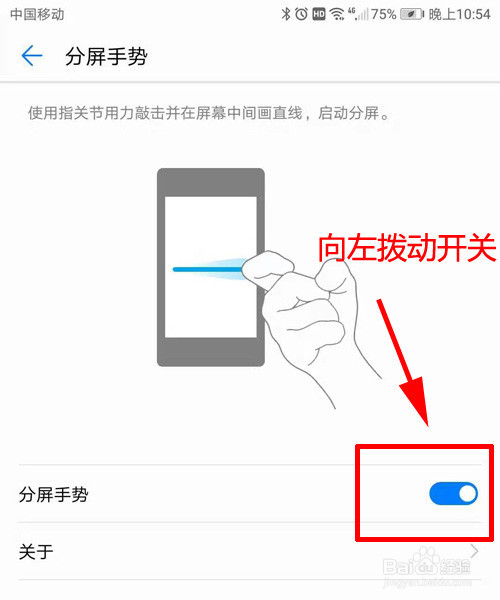 在打开的分屏手势界面,在开关按钮处,标的目的左拔动开关,封闭分屏模式。