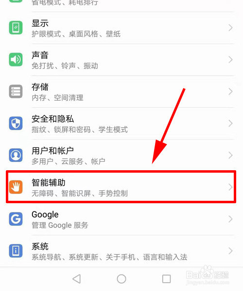 在打开的设置界面,滑动至底部,找到“智能辅助”选项,点击打开。
