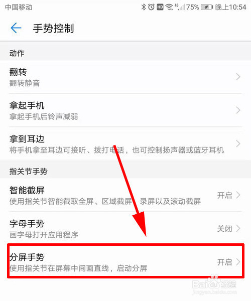 在打开的手势节制界面,找到“分屏手势”选项,点击打开。