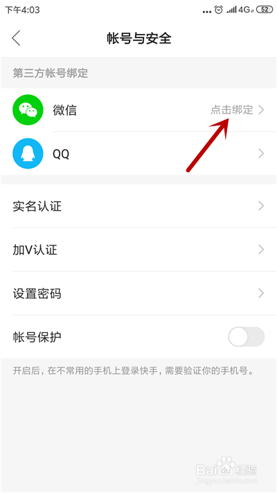 在第三方账号下,点击微信后的“点击绑定”。