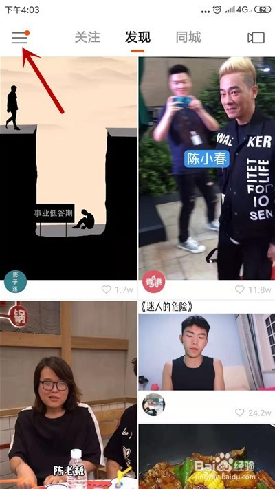 进入快手首页中,点击左上角“三”选项。
