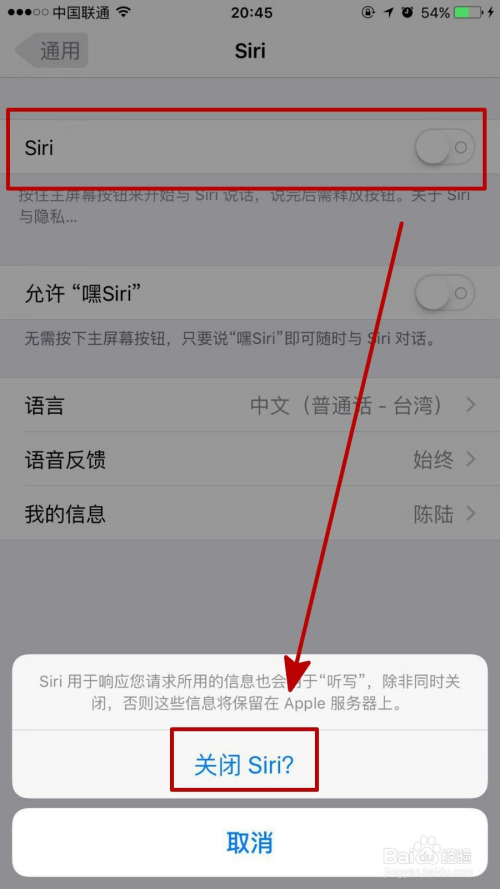 在点击按钮后弹出的下方小框中,选择点击封闭Siri。