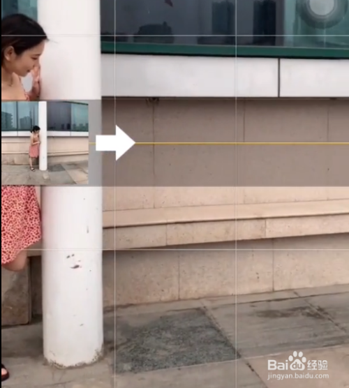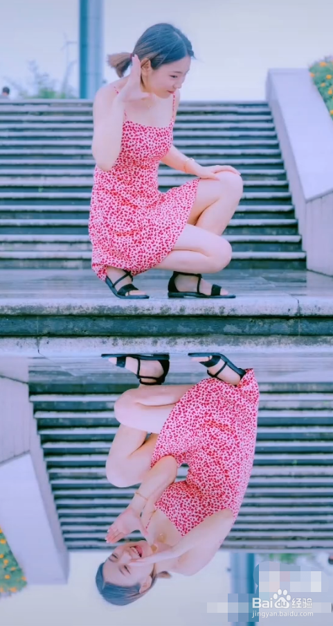 移到水面倒影鱼地面交代处,手机连结不动,人物换个姿势后,手机继续往下移动,拍摄倒影