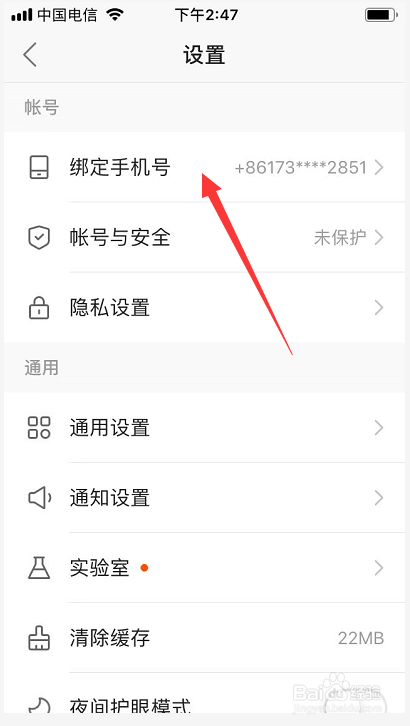 点击后,在设置界面点击绑定手机号选项,如图。