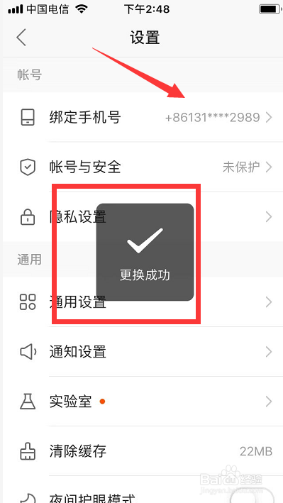 点击确定后,弹出手机号改换当作功提醒,如图。
