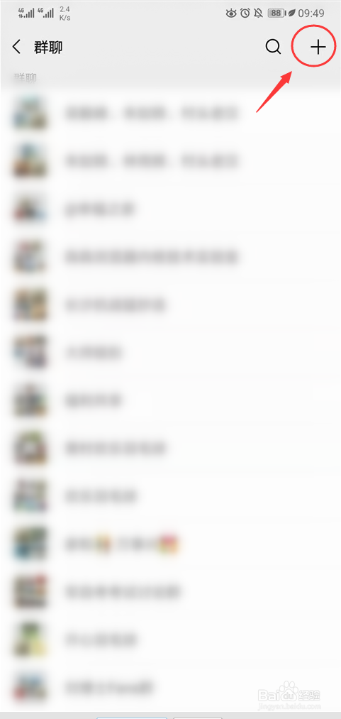 进入了【群聊】列表中,这里的群聊天是保留到通信录里的,若是有的群聊没有保留,需要点击屏幕右上角的【+】按钮