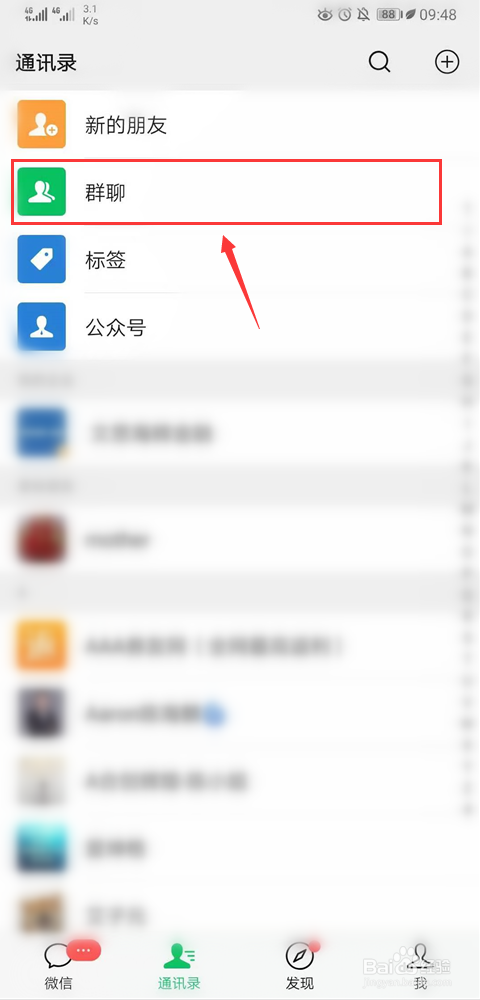 进入了【通信录】具体页面后,点击页面中上部的【群聊】选项,进入群聊列表页面