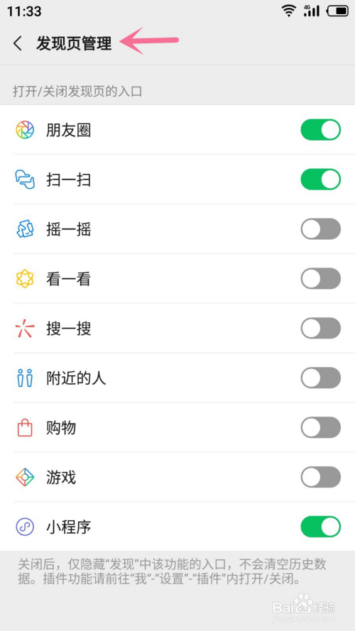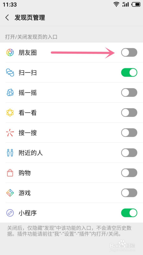 3.在发现页办理里打开朋友圈后面的按钮,按钮酿成绿色就代表当作功开启朋友圈;