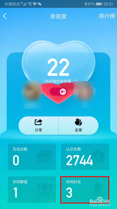在打开的“亲密度”页面,可以看到我和TA的互动次数、熟悉天数、配合群组和配合老友。