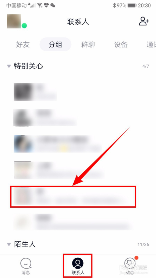手机打开QQ App,在“联系人”页面,点击要查看配合老友的人。