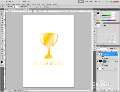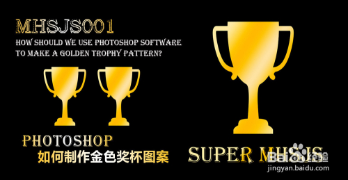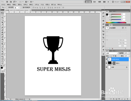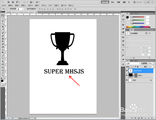 点击【自定外形东西】,点击【外形图层】并将外形颜色设置为:黑色。点击【设置待建立的外形】,按图示选择一个奖杯图案并在作图区域绘制出来。点击【文字东西】,输入文字内容:SUPER MHSJS,建造出一个文字图层(如图所示);