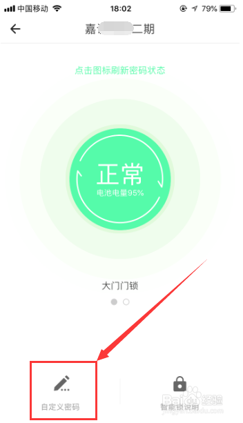 然后就会进入智能门锁的设置页面,可以看到当前智能门锁的残剩电量环境,而且可以摆布滑动切换大门门锁和内门门锁,点击左下角的“自界说密码”就可以进行门锁密码的点窜,如图所示。