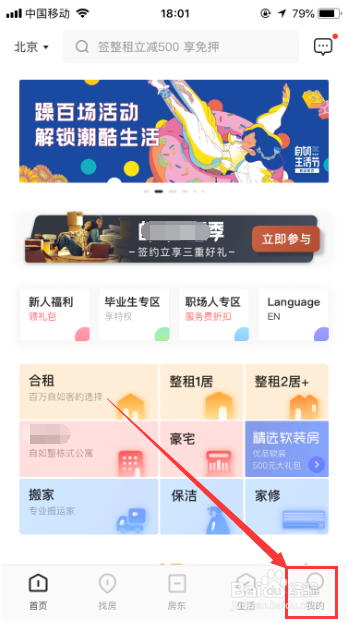 登录之后,进入自如的首页,点击右下角的“我的”,进入自如小我中间,如图所示。