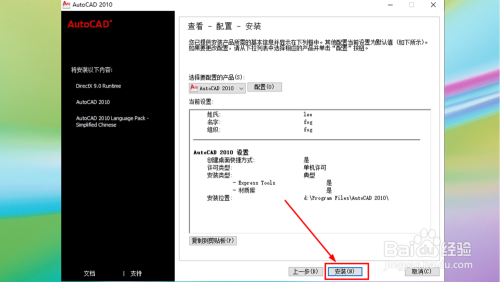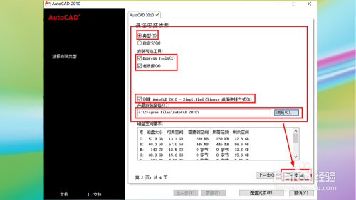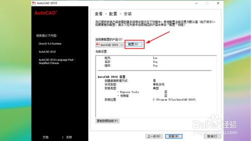 7.设置装备摆设CAD2010:选择许可类型、选择安装类型、安装路径;