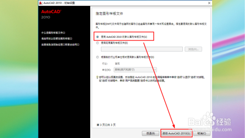 接着指定图形样板文件,这里我们选择利用AutoCAD 2010的默认图形样板文件点击【启动AutoCAD 2010】。
