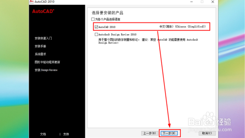 选摘要安装的产物,这里我们勾选Auto CAD2010点击【下一步】即可,当然您也可以勾选Autodesk Design Review 2010,不外不建议初学者安装。