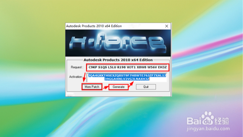 在Request行按键盘Ctr+V粘贴方才我们复制的申请号,点击【Mem Patch】打下补丁,接着点击【Generate】生当作激活码,选择并复制后回到激活程序。