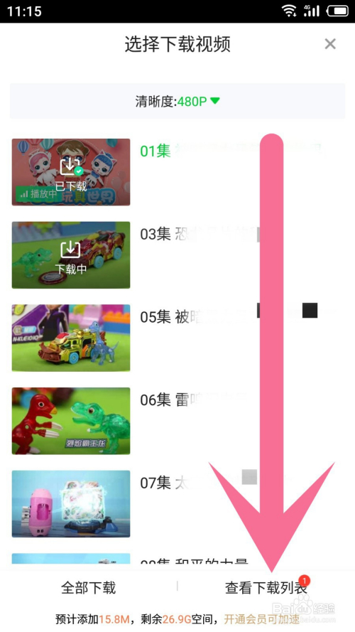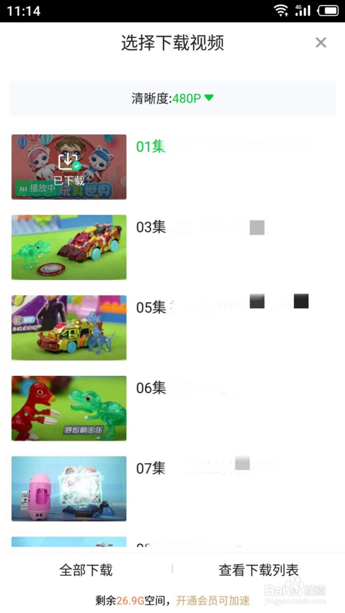 鄙人载界面选择你需要下载的集数,想全数下载就点击左下角全数下载按钮下载,只想下载几个视频就点击需要下载的视频进行下载。