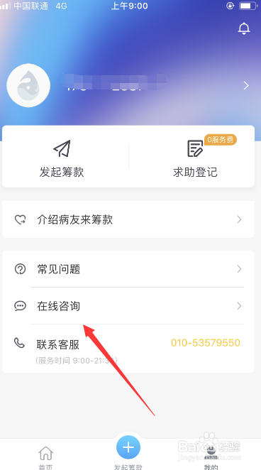 进入我的页面后,如下图红标位置所示,点击页面中的在线咨询进口。
