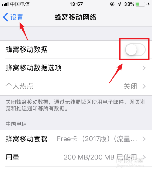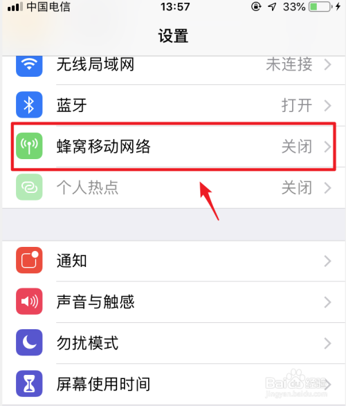 点击后,将手机的蜂窝移动数据的开关打开,然后返回到设置。