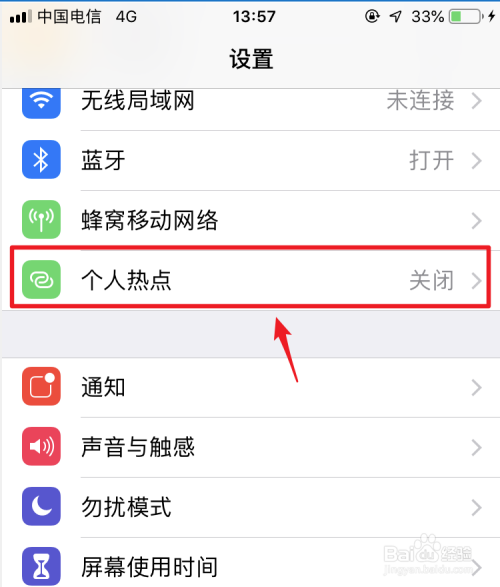 在设置中,选择小我热点的选项进入。