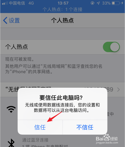 点击信赖后,输入手机的锁屏密码,信赖该电脑。