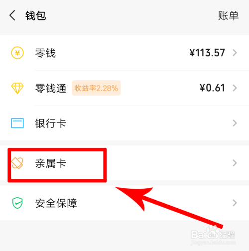 新页面找到“亲属卡”选项。