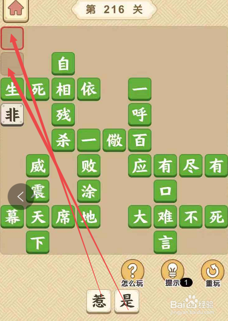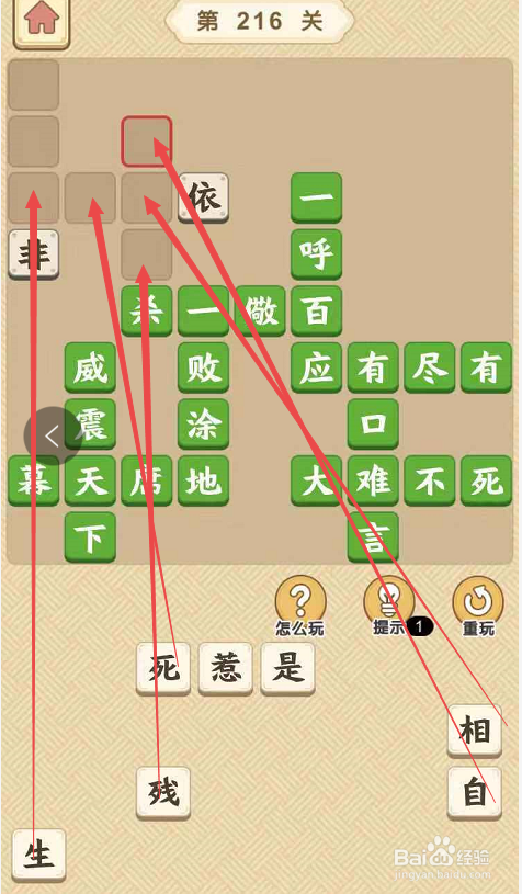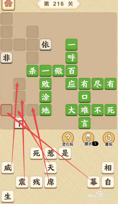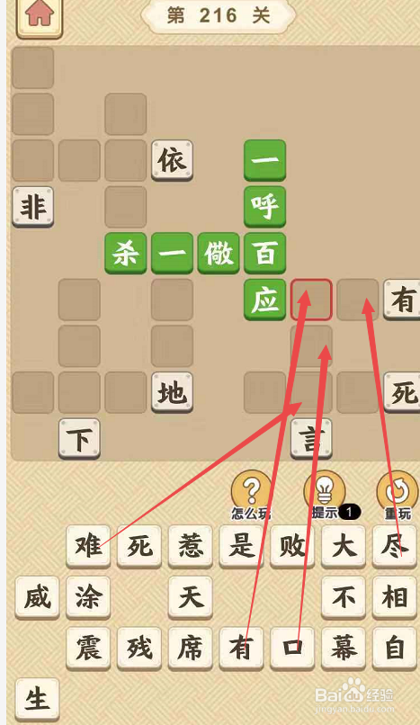 点击当作语小秀才手游,起头第二百一十六关的挑战。首先,将“一”和“杀”之后,将"儆"填在“一”之后,将“百”填在“儆”之后,构成“杀一儆百”,然后将“呼”填在“一”和“百”之间,将“应”填在“百”之下构成当作语“一呼百诺”。