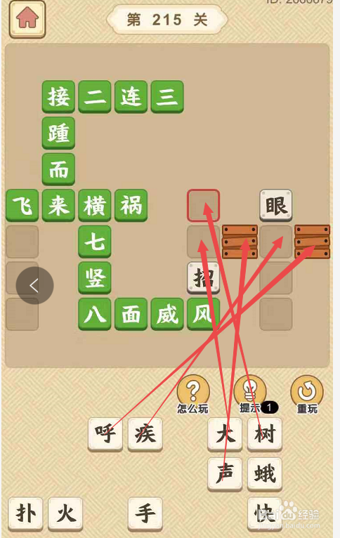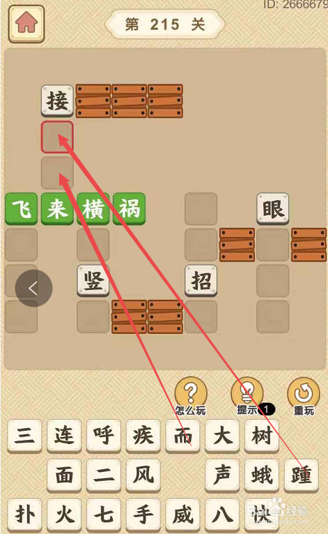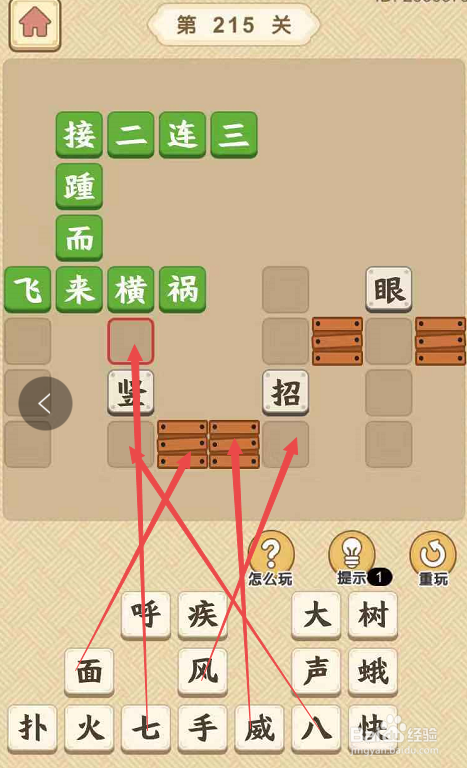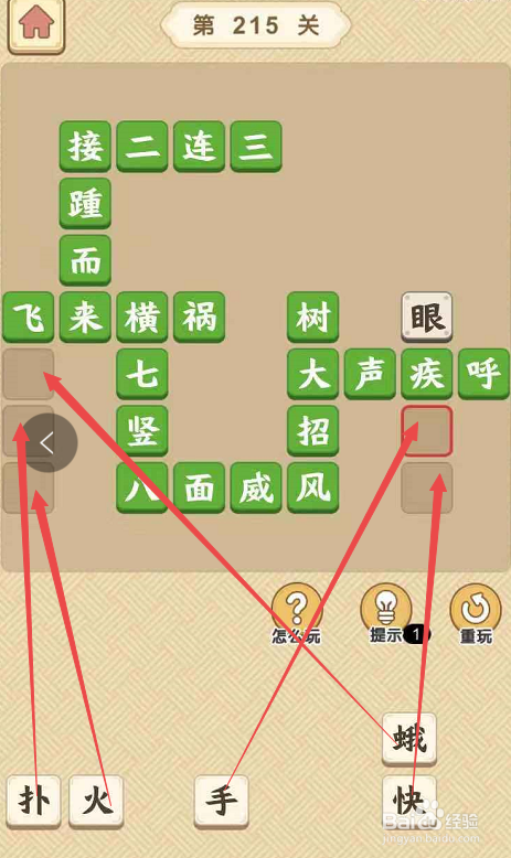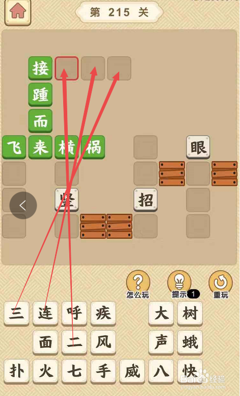 点击当作语小秀才手游,起头第二百一十五关的挑战。首先,将“飞”填在“来”左侧,将“横祸”填在“来”右侧,构成“飞来横祸”,并断根飞和来上下的障碍。