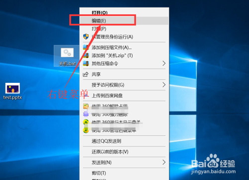 然后在“关机.bat”文件上点击鼠标右键,在右键菜单中选择“编纂”,如图所示;