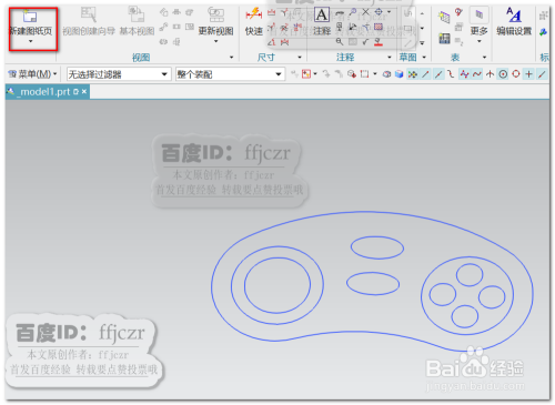 点击,建立根基视图;在弹出的对话框中选用俯视图作为模子视图。比例为1:1.鼠标在页面上确定俯视图的放置位置后点击,即可。